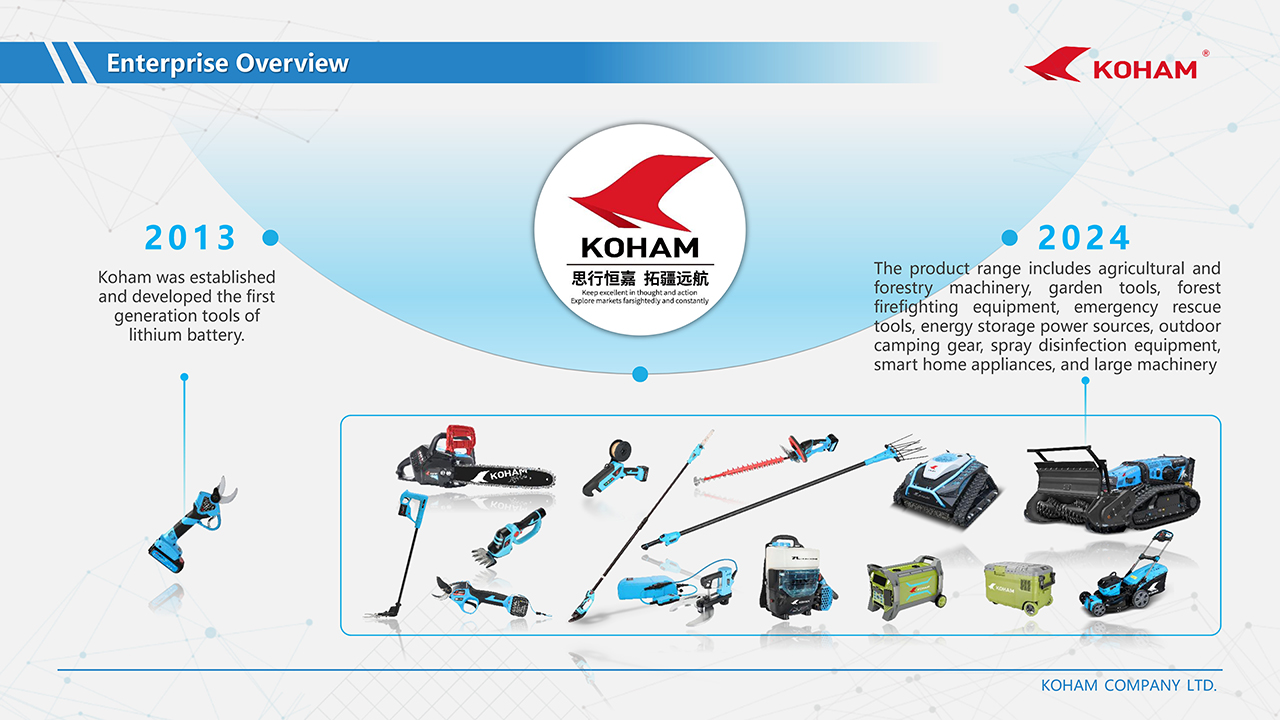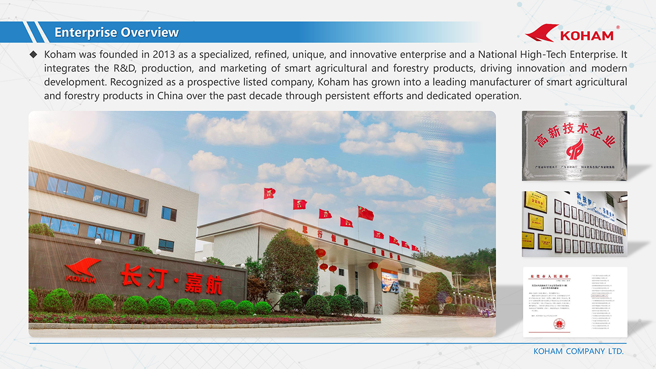Koham was founded in 2013 as a specialized, refined, unique, and innovative enterprise and a National High-Tech Enterprise. It integrates the R&D, production, and marketing of smart agricultural and forestry products, driving innovation and modern development. Recognized as a prospective listed company, Koham has grown into a leading manufacturer of smart agricultural and forestry products in China over the past decade through persistent efforts and dedicated operation.